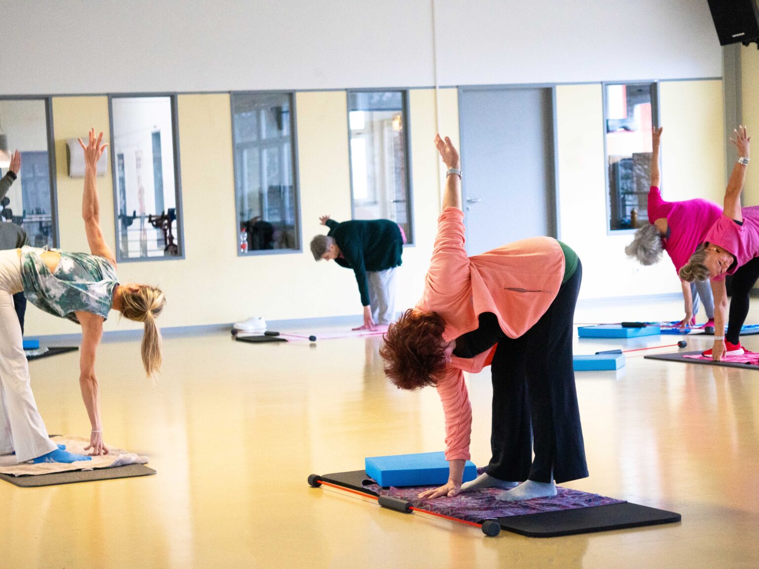 Mobilisation im Bereich Schultern, Rücken, Hüfte und Knie stehen im Vordergrund. In regelmäßigen Abständen werden Zirkeltraining und Beweglichkeitseinheiten mit und ohne Faszienrolle eingebaut.